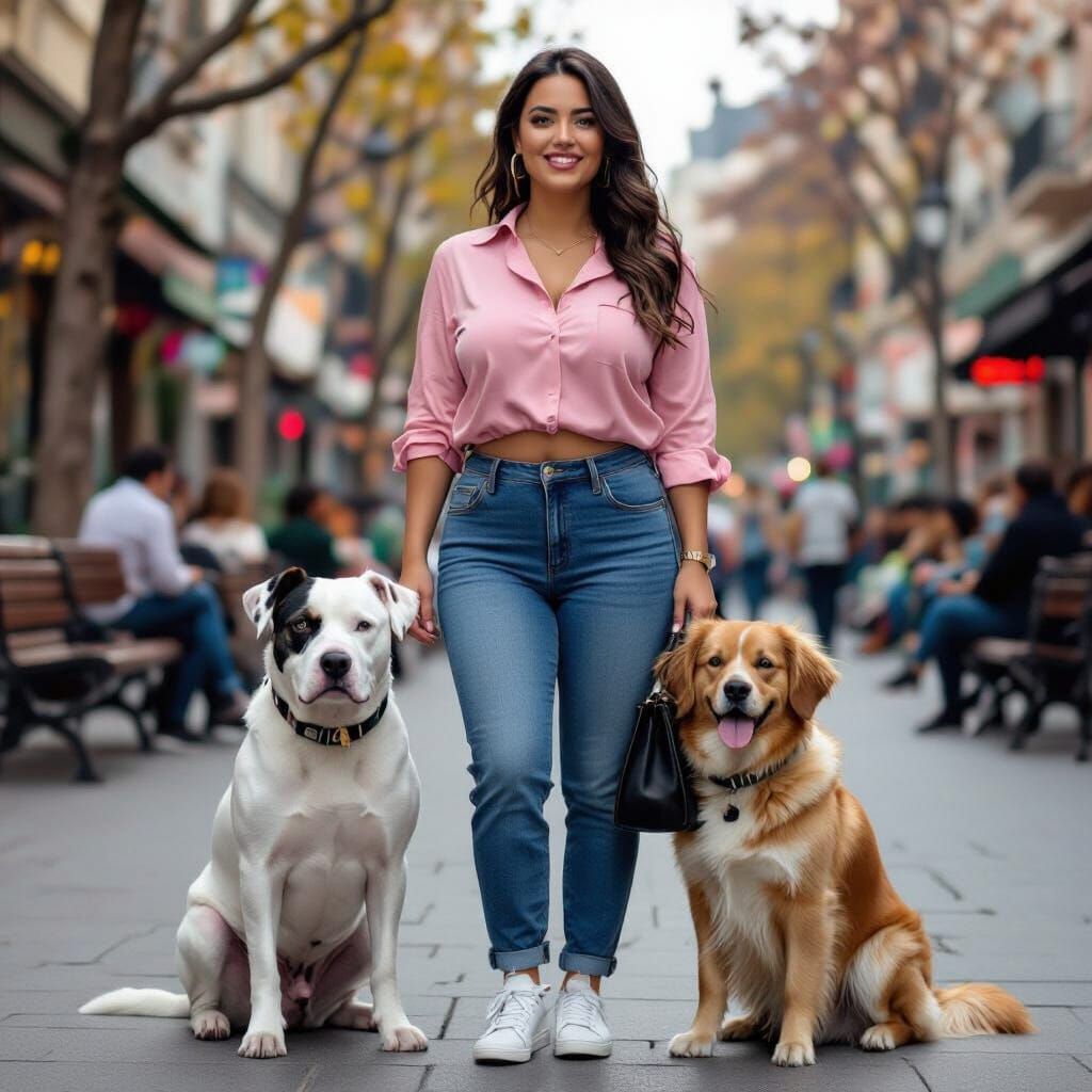 This image depicts a robust woman with black and white wavy hair and brown eyes, accompanied by a white pitbull and a brown mixed-breed dog. The scene is set in a park during golden hour, rendered in a vibrant concept art style with warm, dreamy lighting.