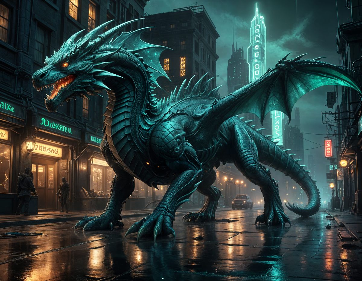 A photorealistic image of a massive, glowing dragon attacking a futuristic city. Emerald flames engulf skyscrapers in a scene blending high-tech and ancient elements with intricate details.