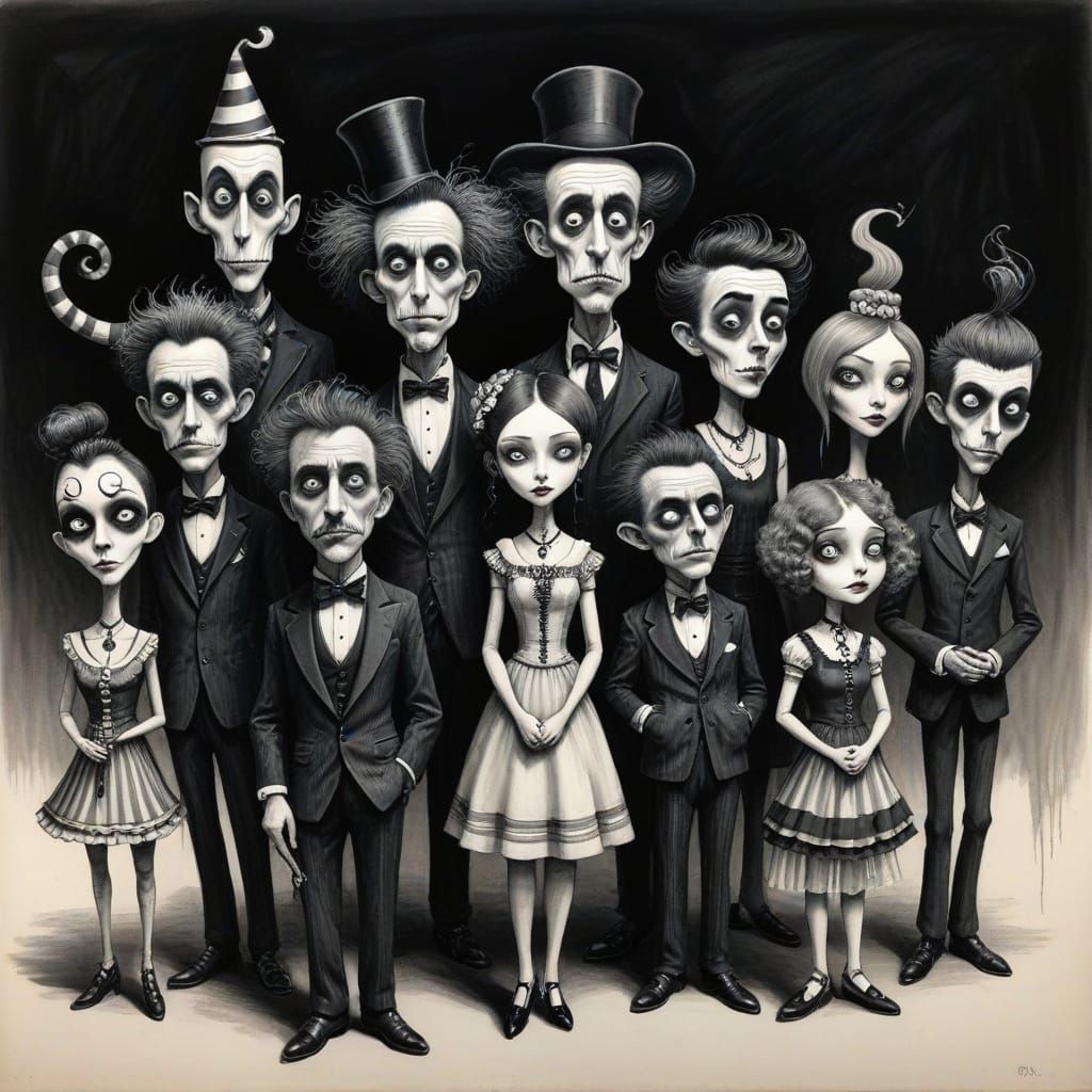 This image shows a monochrome charcoal drawing of a band of 1920s circus freaks. The artwork is in the style of Tim Burton, known for his distinctive and darkly whimsical aesthetic.