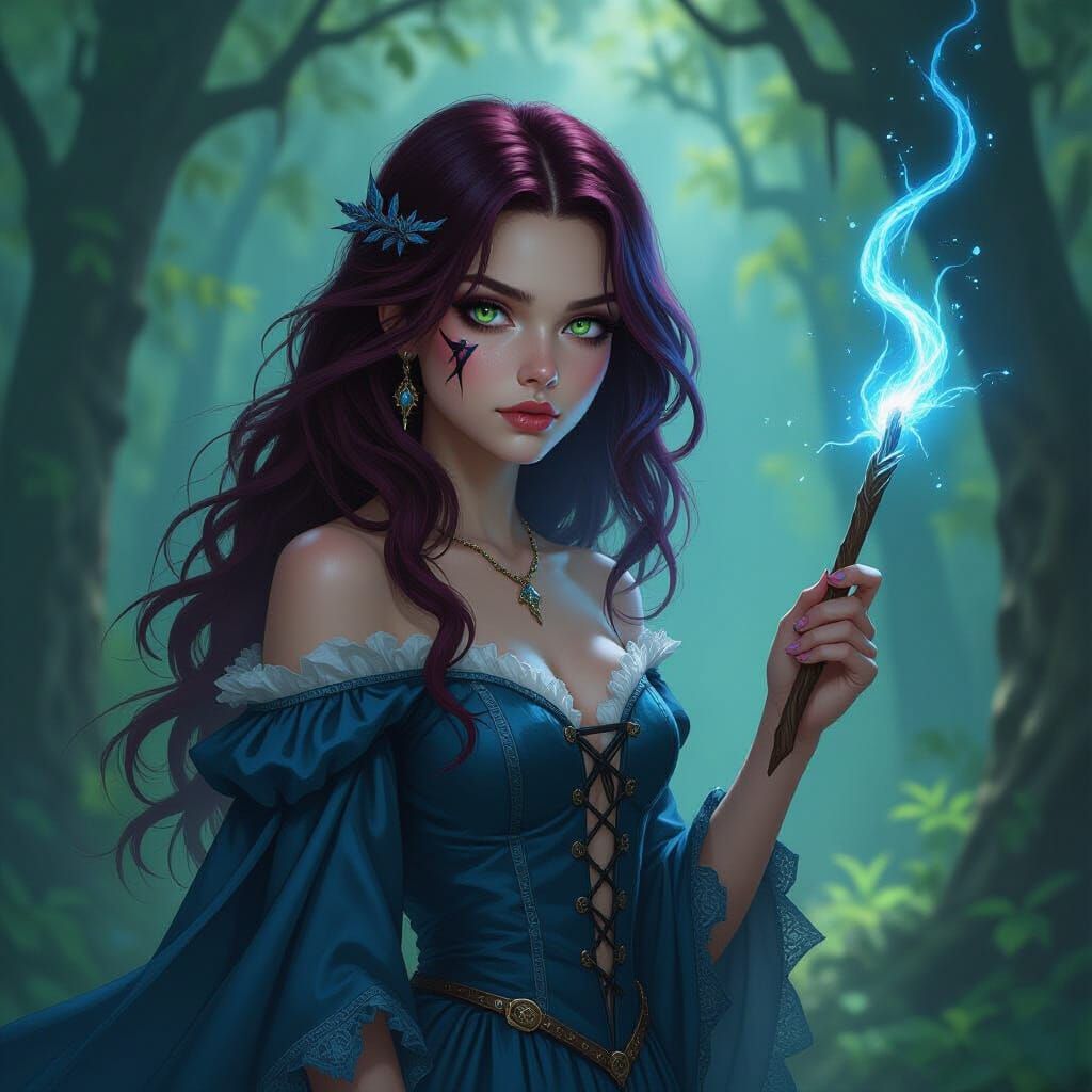 A dark fantasy concept art image of a young sorceress in a tattered gown, holding a glowing wand with a magical snake. Atmospheric lighting and mystical blues and silvers create an ethereal mood.
