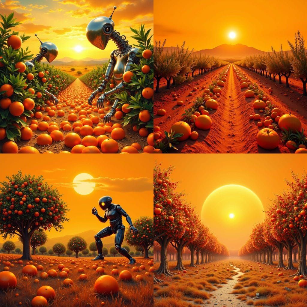 This image depicts fields of genetically modified orange trees tended by intelligent robots in a solar, vintage, and futuristic style.