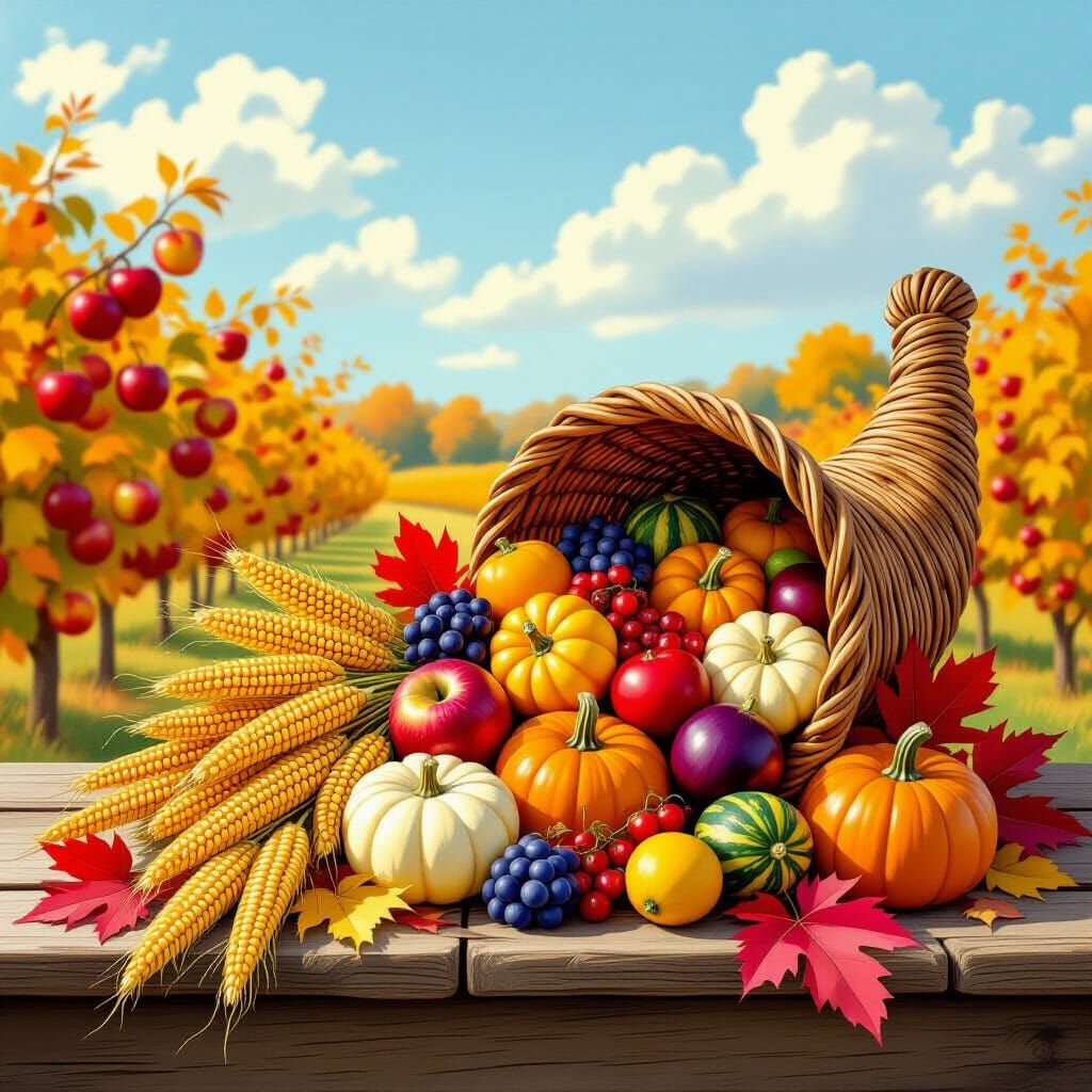 This image depicts a bountiful cornucopia filled with autumn fruits and vegetables on a wooden table, arranged with wheat and leaves. Inspired by classic storybook illustrations, it has warm colors and soft lighting.
