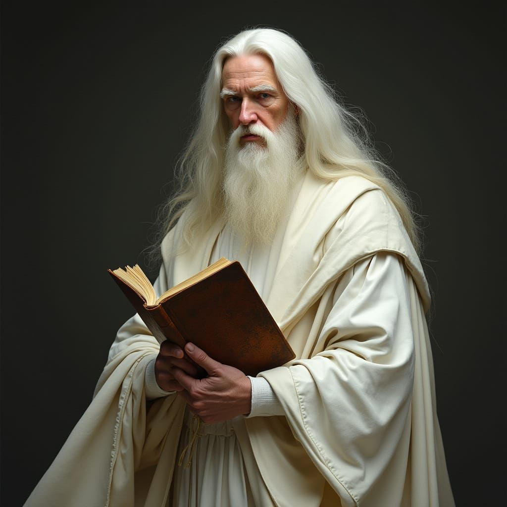 A detailed portrait of a scholar holding an antique book. The image features realistic details and a mystical atmosphere reminiscent of classical art.