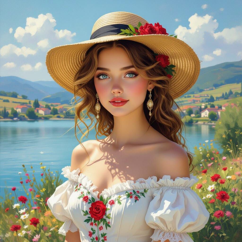 This image shows a serene young woman with golden hair, wearing a rose-adorned straw hat and white floral dress. Set against a tranquil lake and village, rendered with soft, vibrant brushstrokes in the style of Impressionism.
