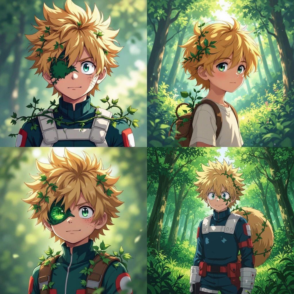 This image shows a My Hero Academia character with golden blond hair and a vine tail. The artwork features deep colors and natural lighting, inspired by Studio Ghibli and Makoto Shinkai.