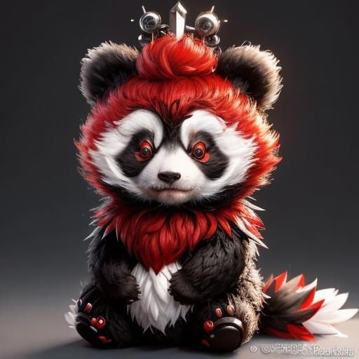 This image shows a cute, fluffy, tiny red baby panda with big chibi eyes. The digital artwork depicts the adorable panda in a whimsical style, resembling knitted yarn and wool.