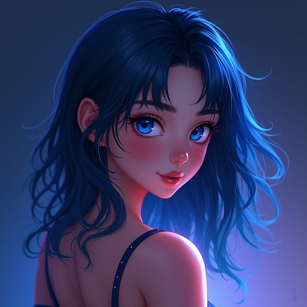 This digital art features a captivating woman with dark blue hair and striking blue eyes. Dramatic backlighting creates an ethereal glow, rendered in a vibrant, saturated style with smooth lines.