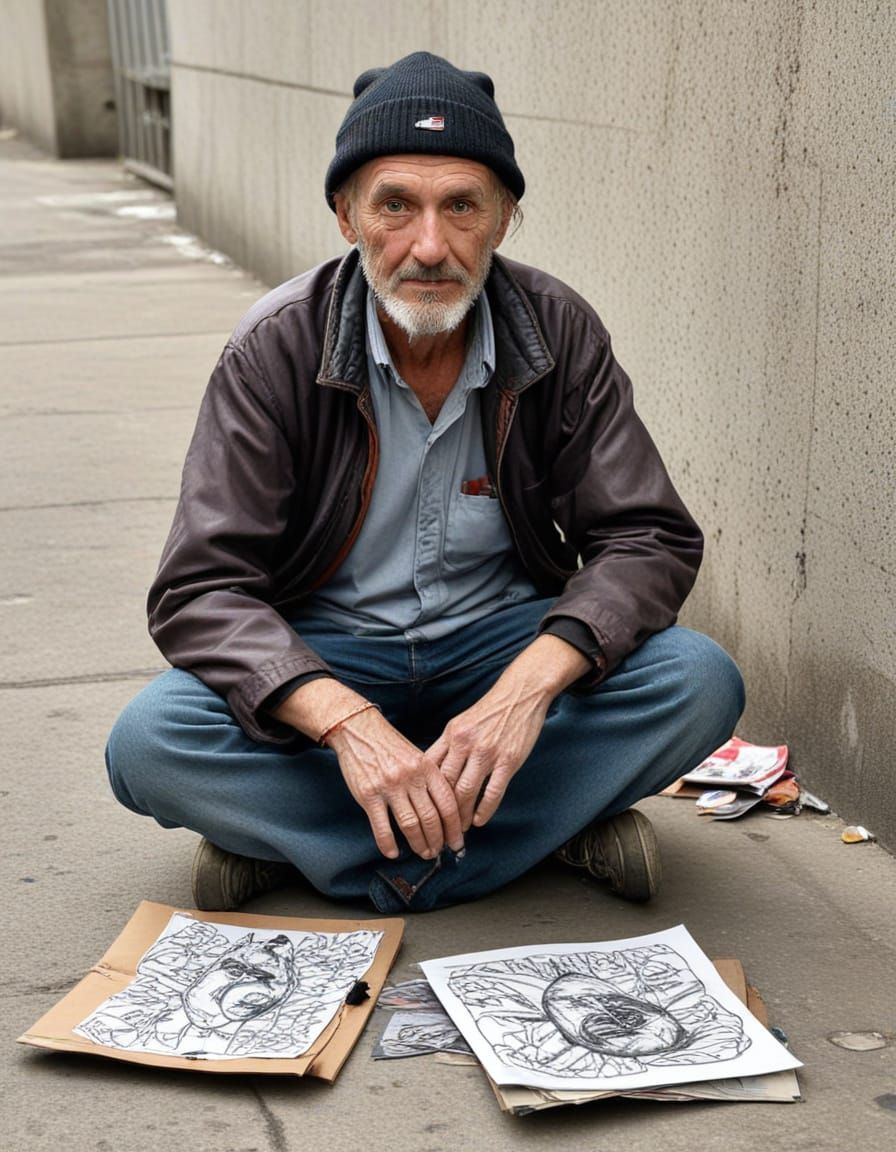 This image shows a determined homeless artist creating vibrant street art with a mix of graffiti and stencil techniques, conveying resilience and creativity in the face of adversity.