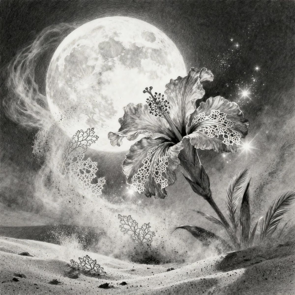 This hyper-detailed charcoal drawing features a rare flower amidst swirling sand, illuminated by a full moon. It showcases delicate patterns and soft textures, evoking a dreamy atmosphere.