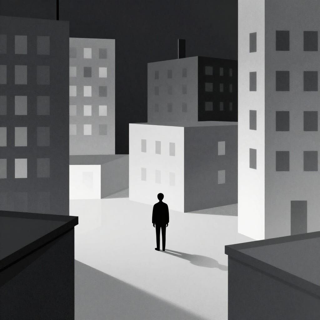 This image features a solitary figure silhouetted against a simplified, geometric city at night. Rendered in a stark vector art style with heavy outlines and dramatic chiaroscuro, it evokes a moody, mysterious atmosphere.
