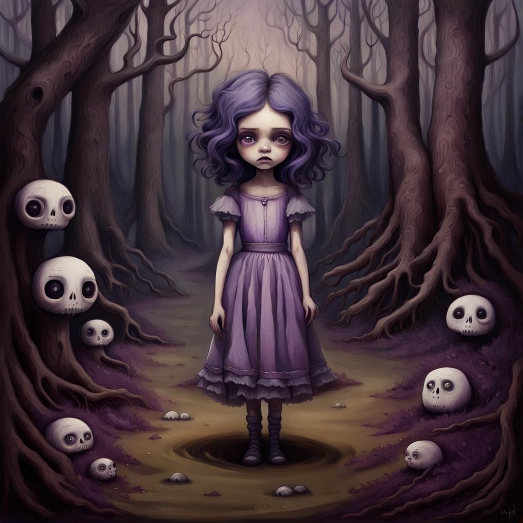 A surreal painting of a sad girl in a purple dress standing in a spooky forest. The artwork blends elements of dark fantasy with a chibi style, featuring haunted eyes and wild hair.