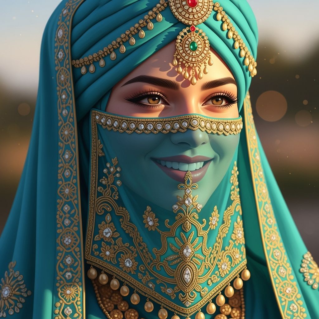 This digital painting showcases a woman's warm smile beneath a detailed turquoise niqab adorned with gold embroidery and jewelry, complemented by a matching turban. Golden hour light highlights the opulent attire in a photorealistic style.
