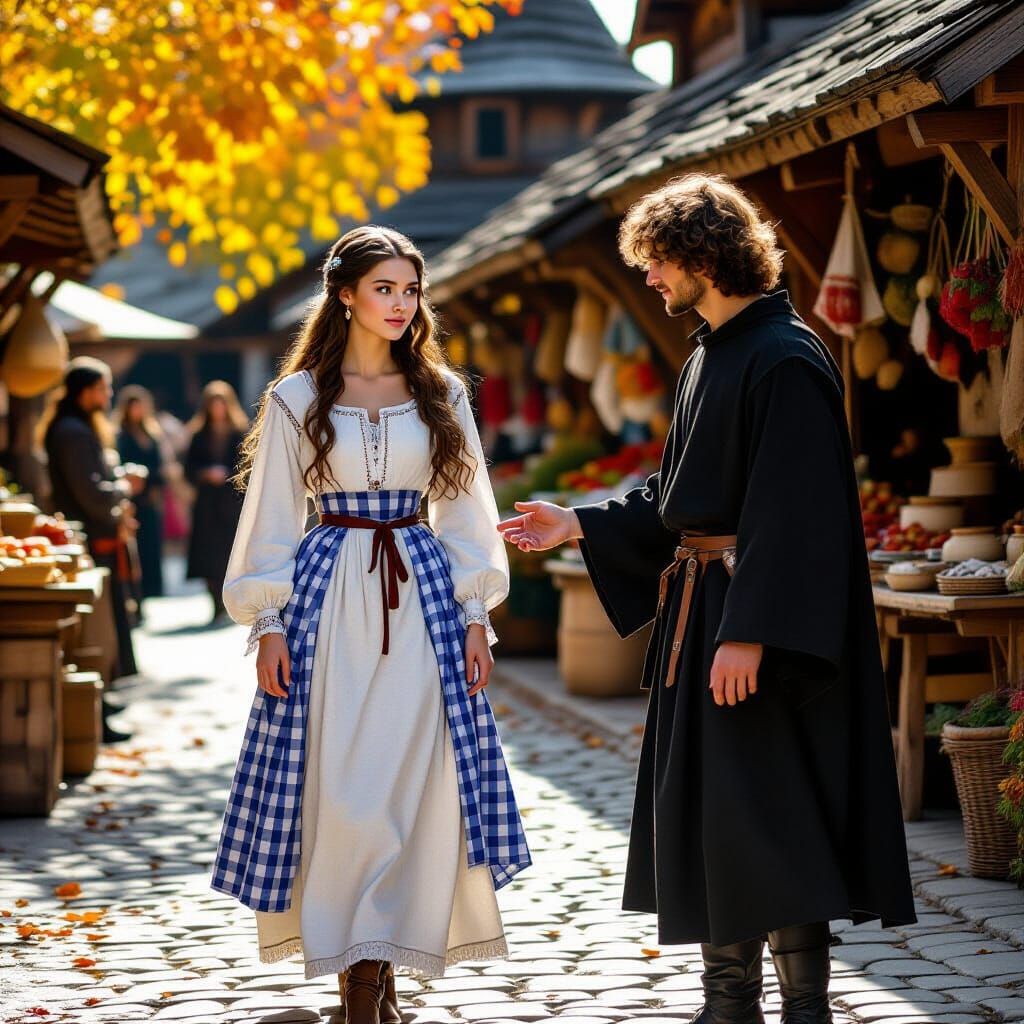 This image shows a young woman in medieval Eastern European clothing being stopped by a monk in a bustling 12th-century marketplace. The hyperrealistic photograph captures warm sunlight and sincere emotion.