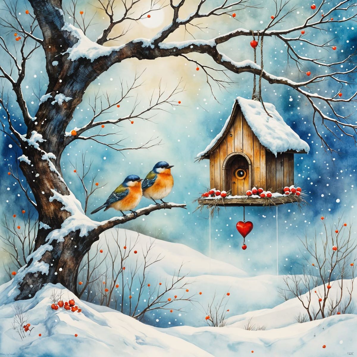 This image shows two colorful birds holding a red heart in a snowy wonderland. Rendered in a detailed watercolor and ink style with fantasy concept art elements.