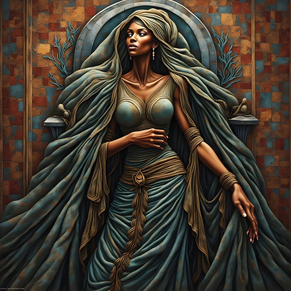 This image blends ancient tapestry and shroud textures with modern artistic elements. A subdued, dark color palette evokes an antique and weathered atmosphere.