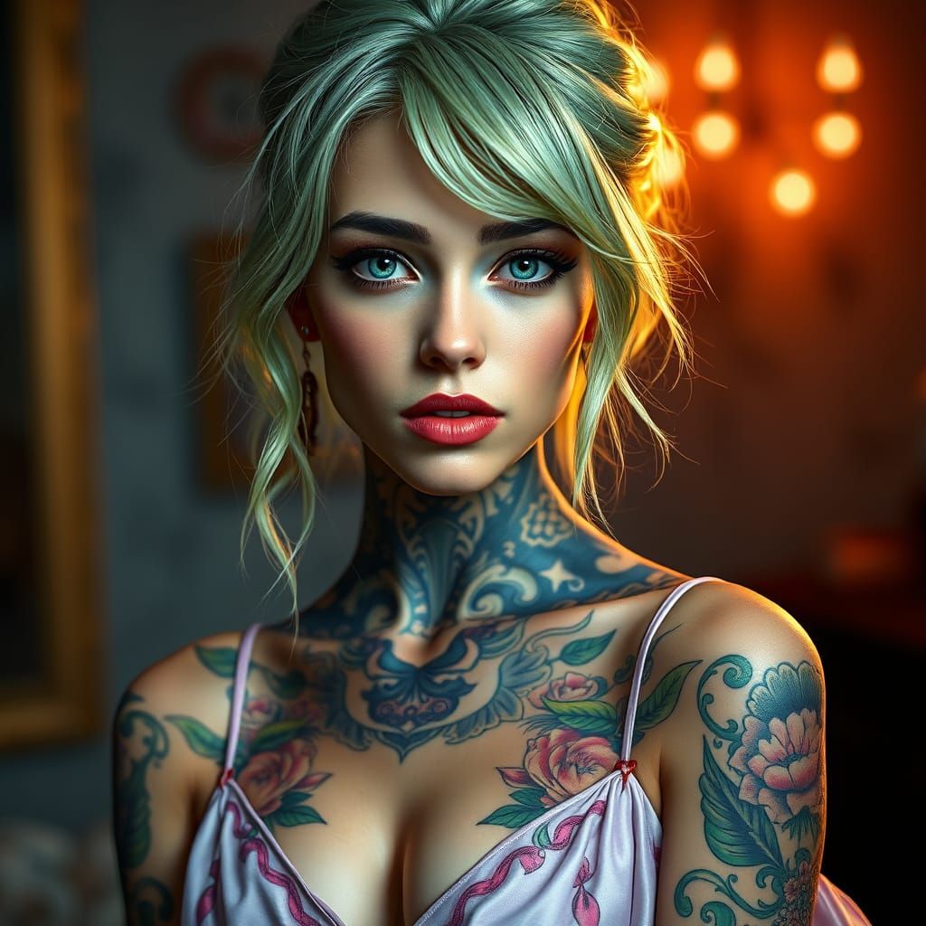 A captivating portrait of a woman with light green hair and colorful tattoos. The image is rendered with hyperdetailed textures and dynamic lighting, creating a vibrant and striking composition.