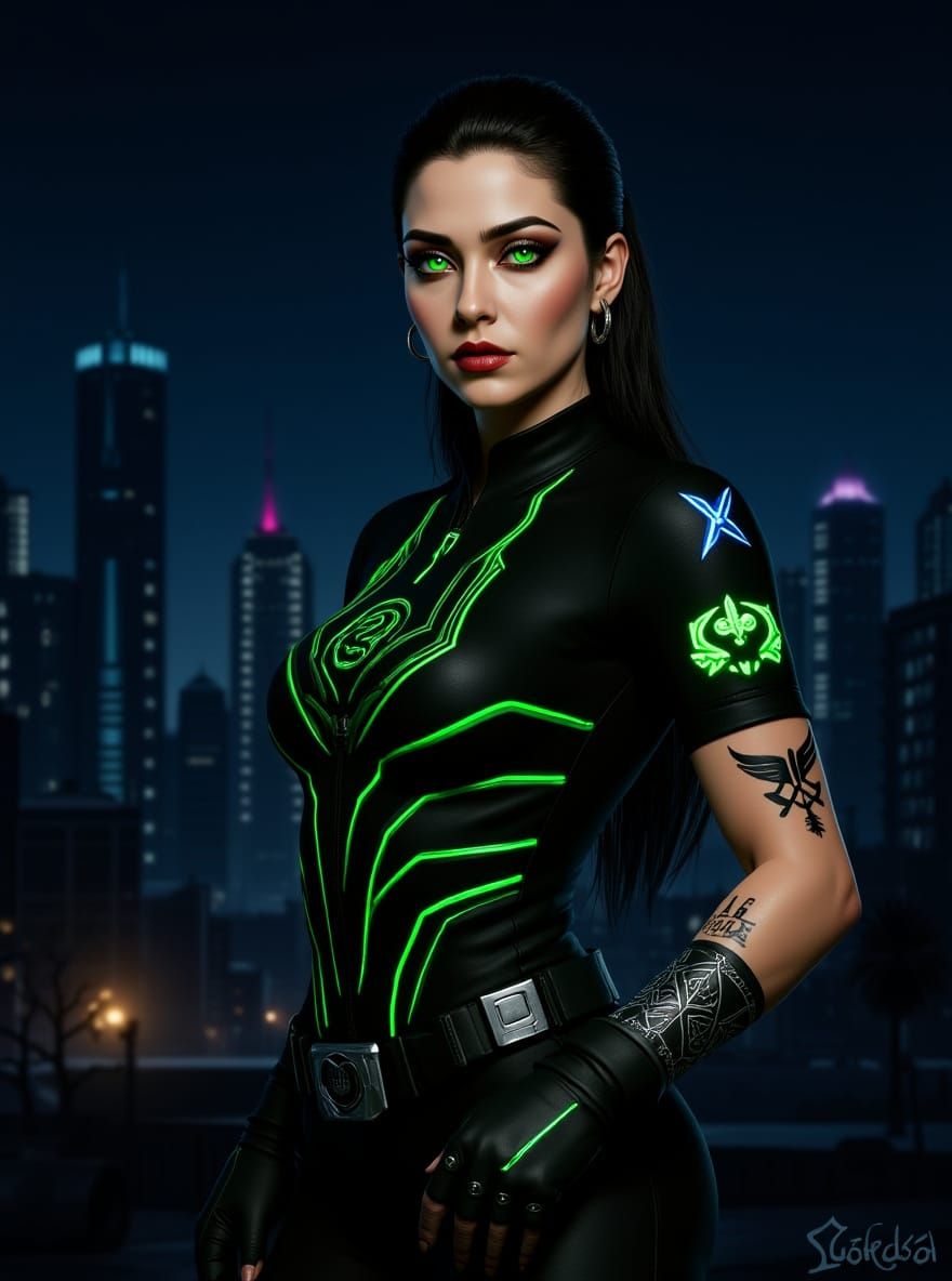 A hyperrealistic image of HaTzefa, a female Israeli superhero, in a black tactical suit with glowing green snake patterns. Set against a dramatic Tel Aviv cityscape at night, in a photorealistic style.