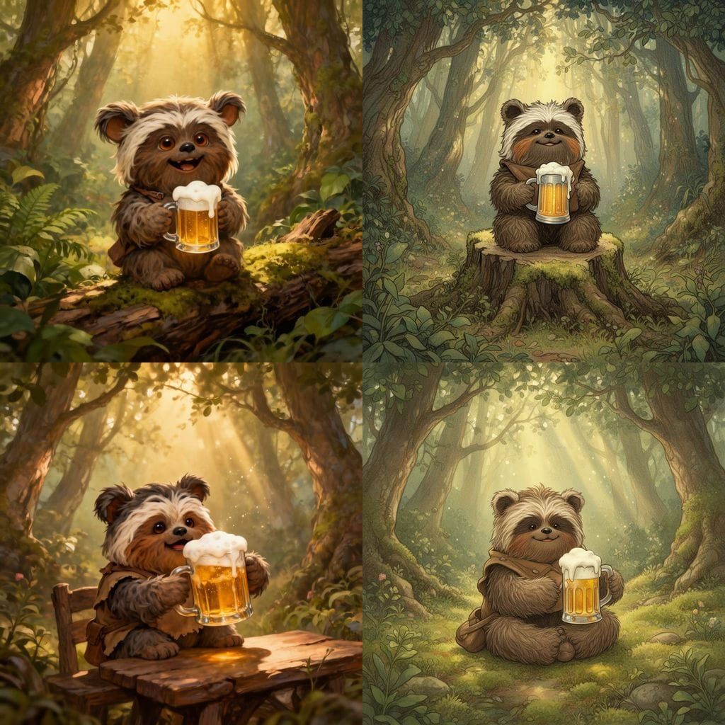 This image depicts a charming Ewok from Star Wars relaxing with a refreshing beverage. A whimsical scene capturing a moment of leisure for the forest dweller.