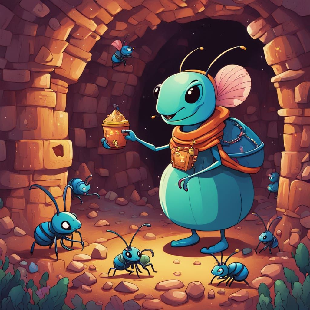 This image shows a vibrant, regal anthropomorphic queen ant surrounded by her loyal subjects, receiving gifts in a beautifully detailed underground city. The artwork features intricate details and a mix of fantasy and realism, creating a captivating scene.