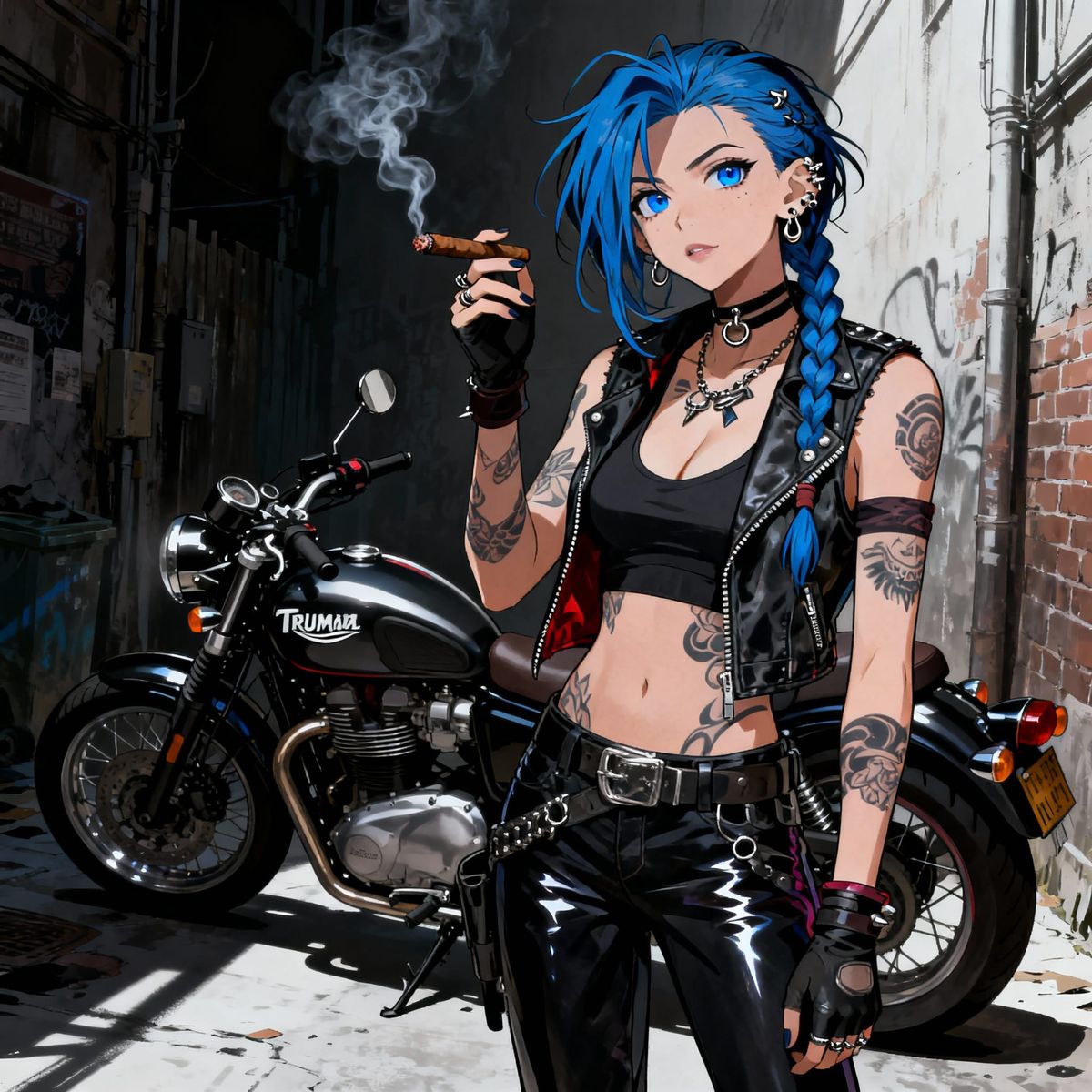 This image depicts a confident woman with blue hair and tattoos, smoking a cigar next to her Triumph motorbike. The noir style features bold shading and high contrast for a sleek, modern feel.