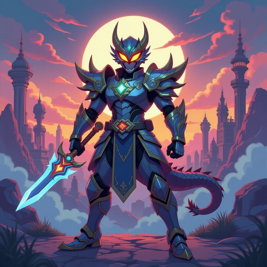 This image features a dynamic demon dragon Power Ranger in Kingdom Hearts-inspired attire, complete with detailed armor and a keyblade. The artwork boasts a vibrant, manga-inspired aesthetic with crisp cel-shading and cinematic lighting.
