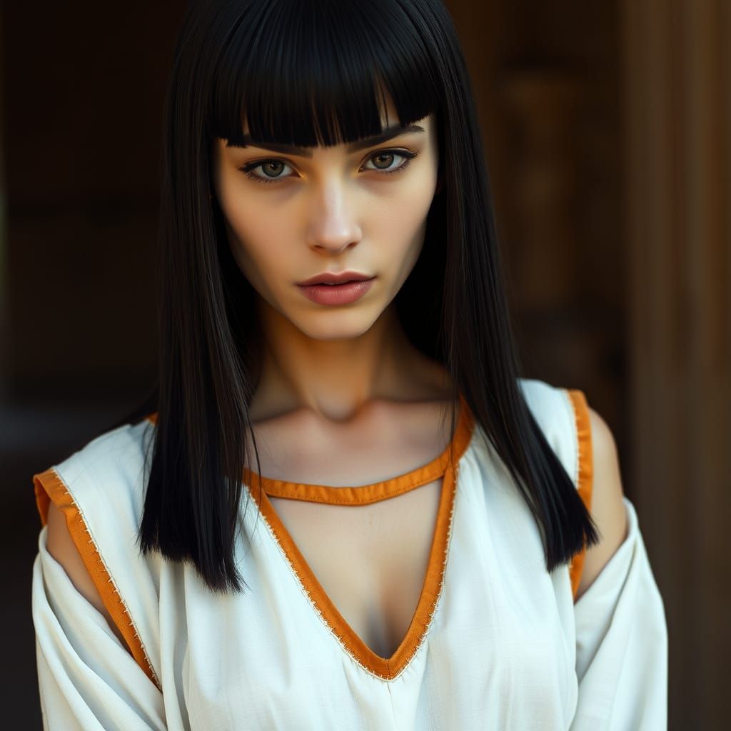 This image shows a modest yet expressive maid with striking features and Egyptian-inspired attire. Her simple linen dress and bronze bracelets suggest a life of observation and quiet strength.