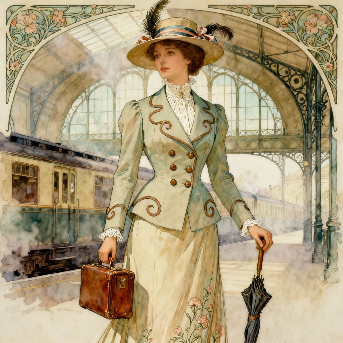 This AI-generated image showcases a beautiful woman from the Belle Époque era, dressed in a sophisticated travelling costume, embodying the Art Nouveau style.