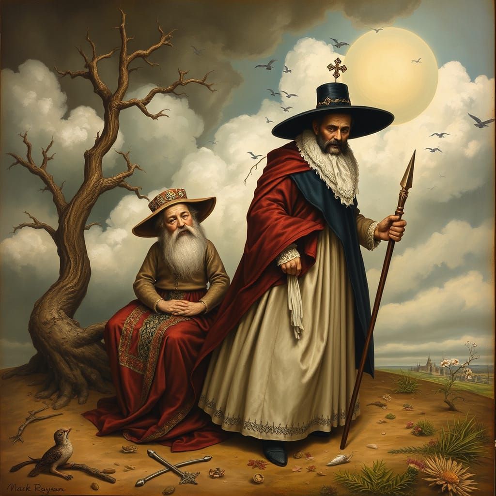 This image depicts a surreal pilgrimage scene. It showcases elements reminiscent of pop surrealism, combining figurative and abstract elements in a whimsical, slightly unsettling style.