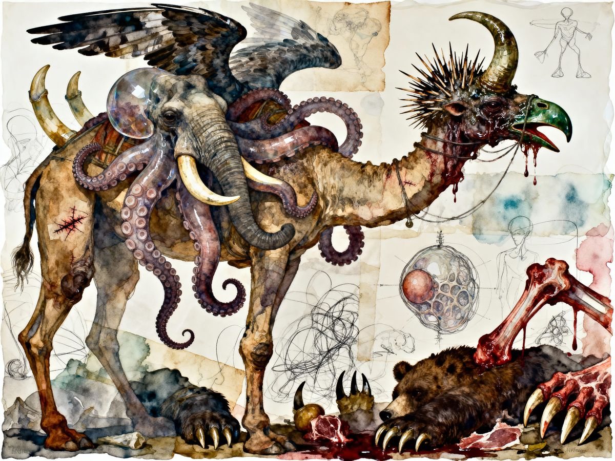 This image depicts a grotesque, mutated creature born from a violent, squalid scene. Rendered in a mixed media collage style with loose, sketchy lines and a 3D effect.