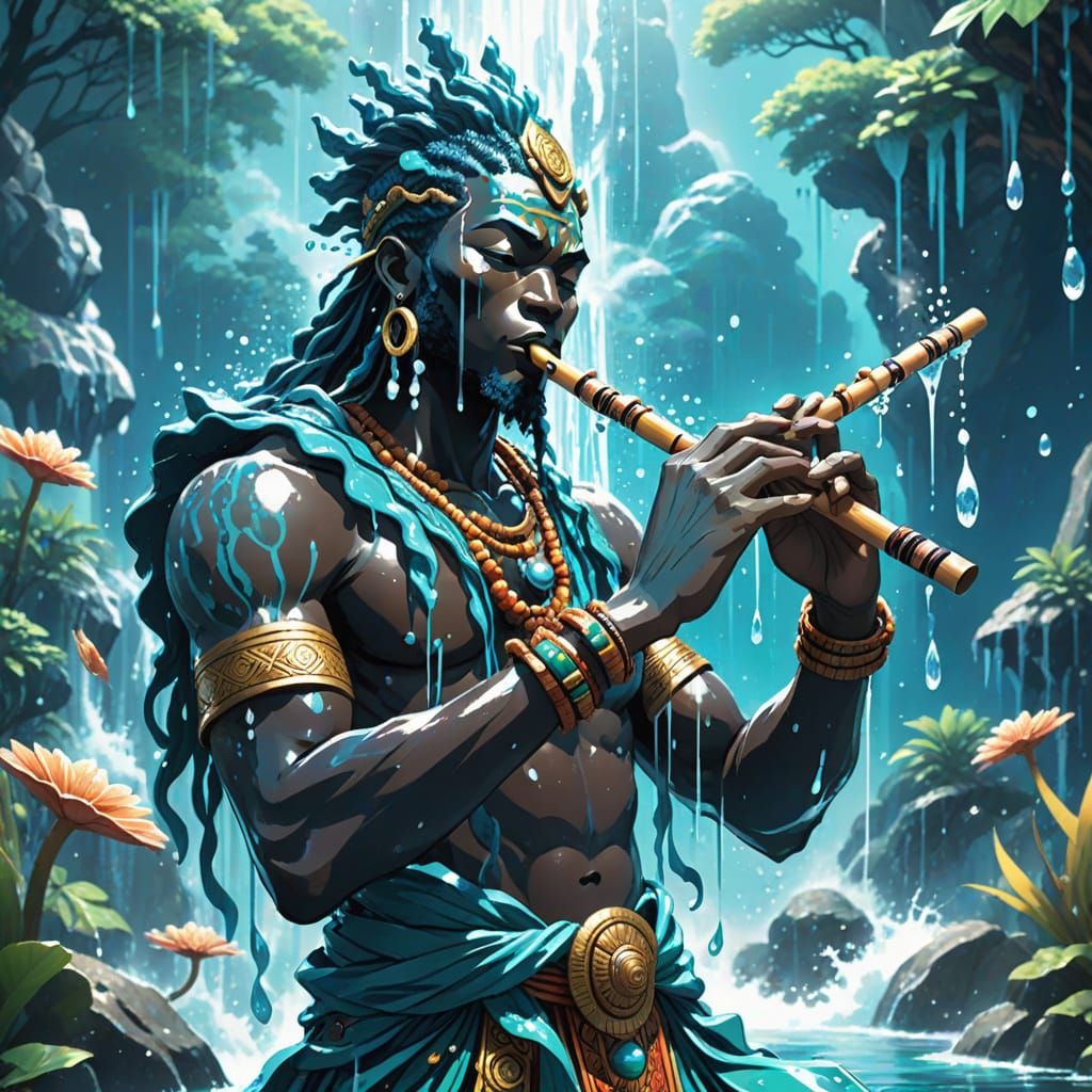 This image shows an African god of strength playing a flute amidst a waterfall, surrounded by water creatures. The artwork features vibrant colors, dynamic shading, and ethereal light, in a manga anime style.