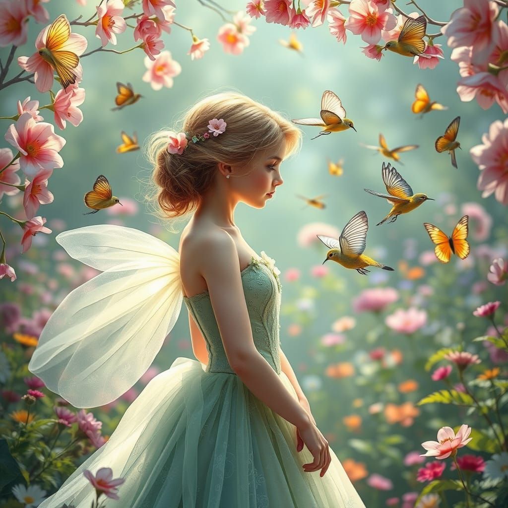 This image depicts a whimsical, realistically rendered fairy interacting with a swarm of colorful butterflies in a vibrant, magical garden setting, characterized by a mix of soft watercolor and vivid acrylic techniques, reminiscent of fantastical art styles.