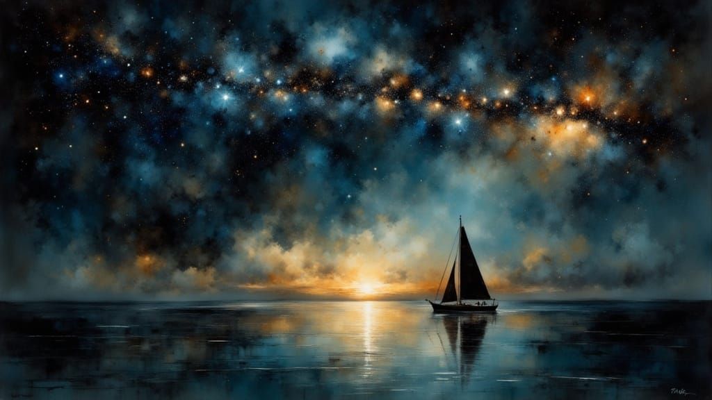 A striking picture of a sailboat sailing under a starry night sky. This oil painting style image features chiaroscuro lighting, rich textures, and impasto techniques to create a soft and realistic atmosphere.