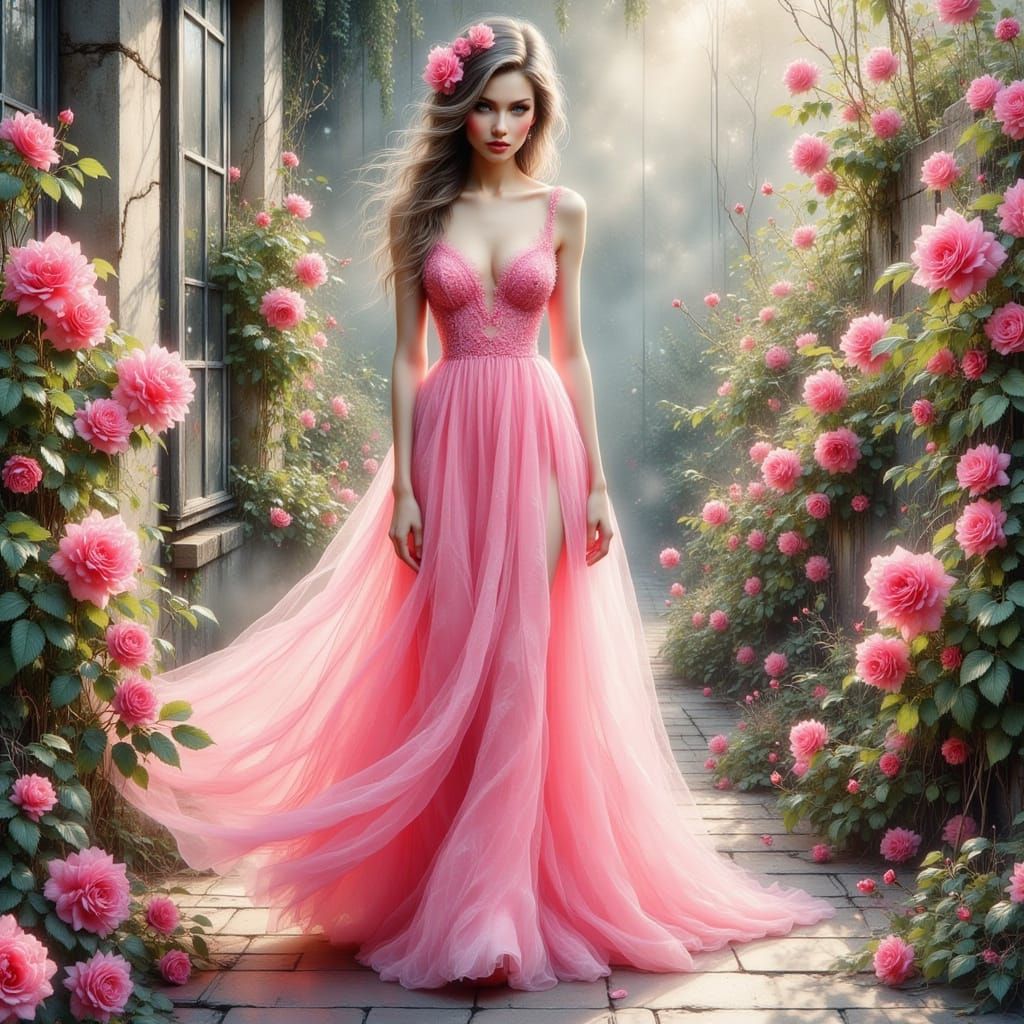 This image shows a woman in a beautiful pink evening gown surrounded by blooming pink roses and soft greenery, evoking the softness of watercolor and the elegance of impressionist art, with a vibrant color palette reminiscent of pop art.