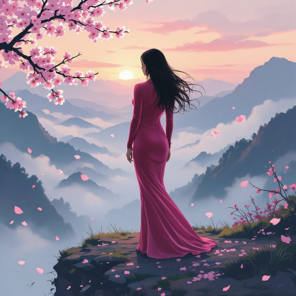 This image shows a woman in a pink bodysuit on a cliff at dawn. Cherry blossoms drift around her as she overlooks a misty valley in this artwork evoking Japanese ink wash and airbrush techniques.