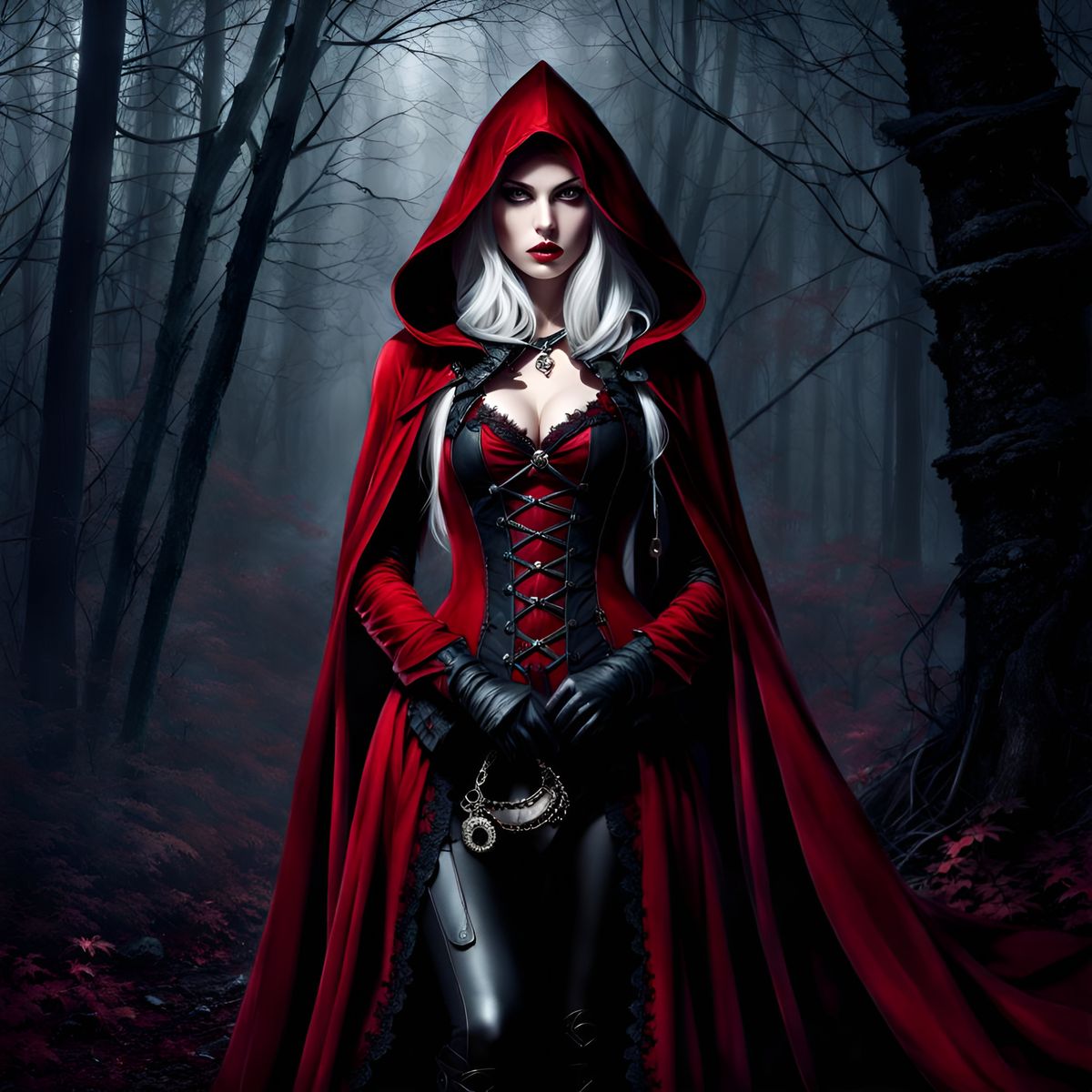 This image shows a gothic enchantress as Little Red Riding Hood in a dark forest. The portrait features a beautiful woman in a dark red outfit with lace details and dynamic lighting.