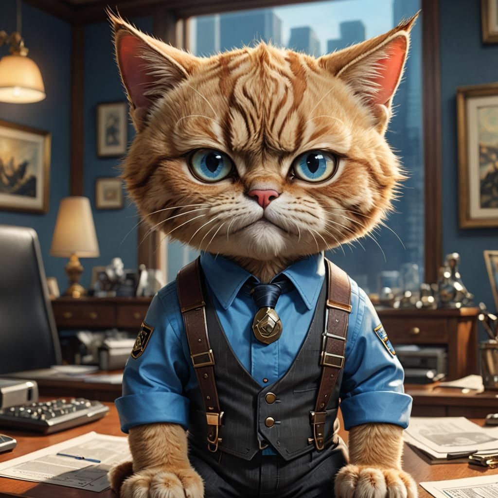 A digital photoillustration of an angry, chibi, kawaii, anthropomorphic cat. Dressed in trade broker attire, the cat is set within a richly detailed broker's room and rendered with volumetric lighting.