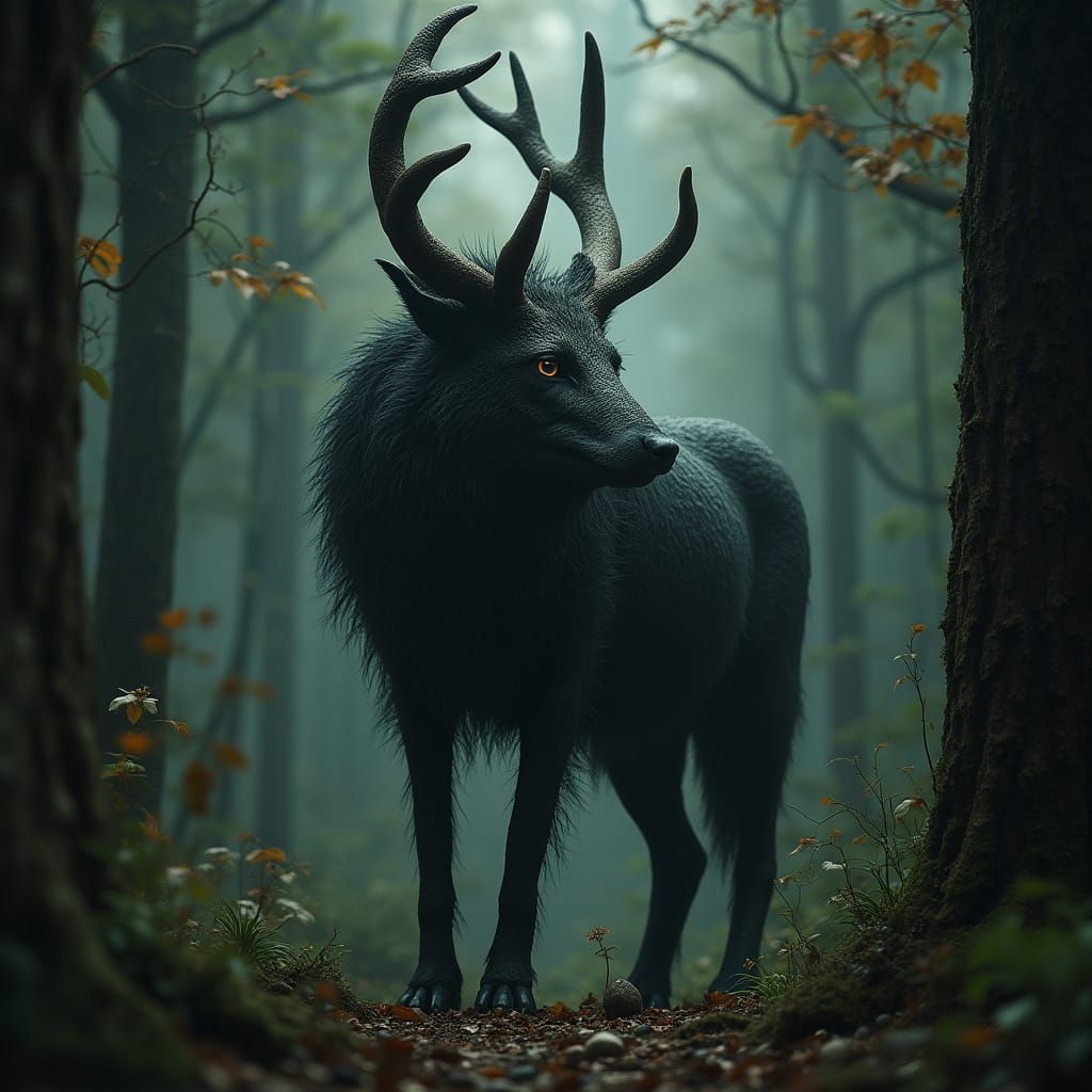 A digital painting of a mythical Ao Ao creature from Guarani legend. The wolf-sheep hybrid with boar-like features stands in a dark jungle, rendered with dark textures in a surreal biomechanical style.