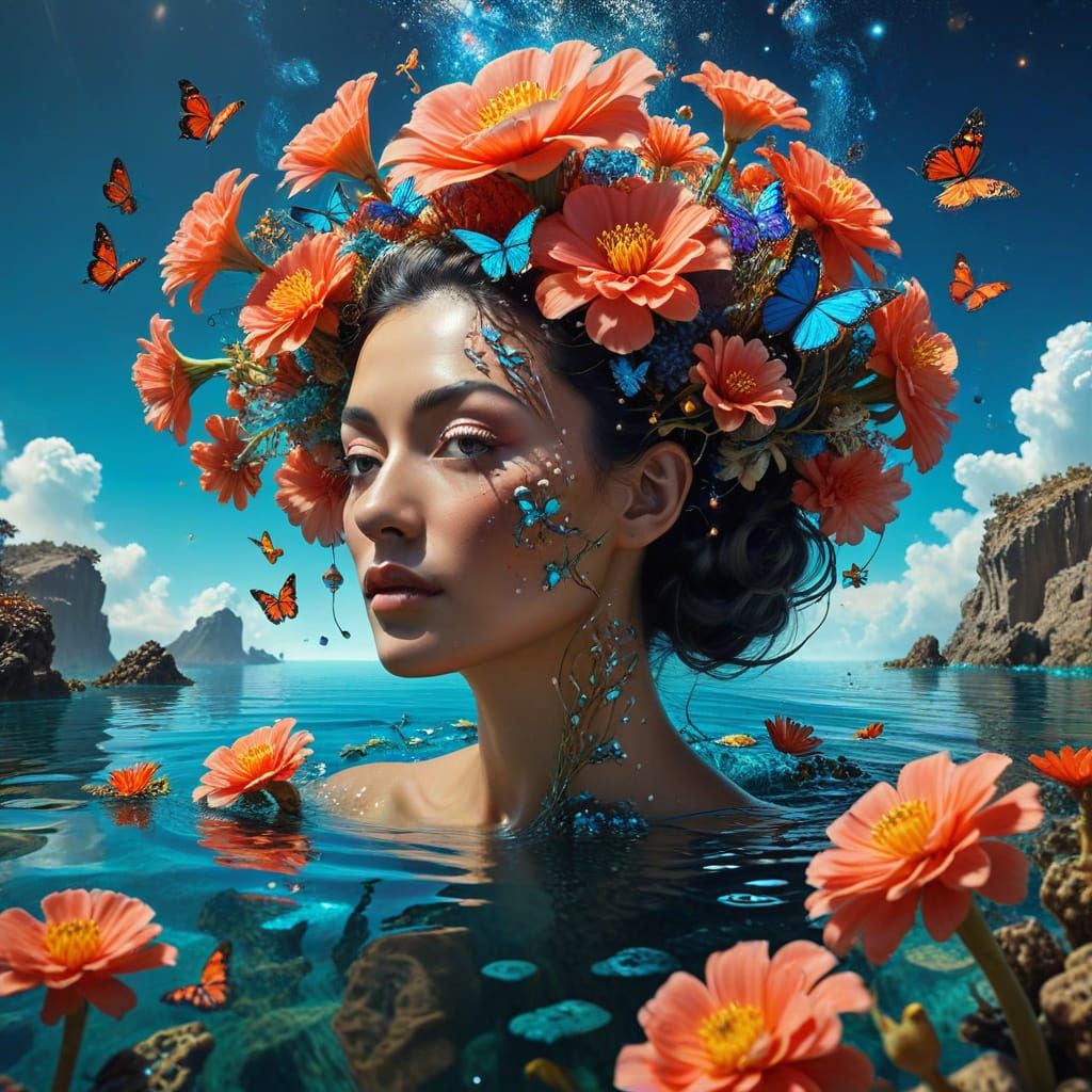 A surreal head and shoulders portrait with giant flowers sprouting from floating islands. Butterflies flutter around coral reefs under twinkling stars in this vibrant expressionist piece.