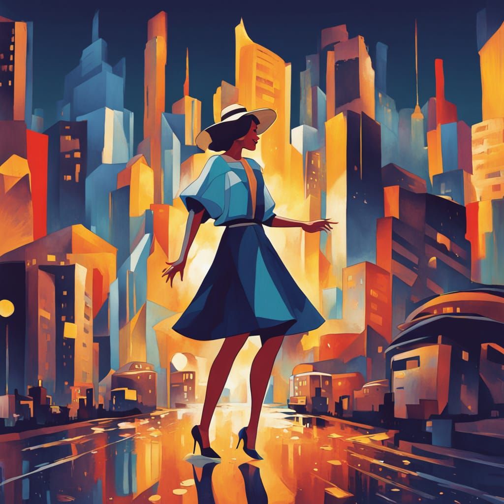 This image captures a stylish woman in motion, dancing through a vibrant, cubist-inspired cityscape with splashed primary colors and glowing streetlights. The scene exudes a surreal atmosphere with expressive emotion and dynamic energy.
