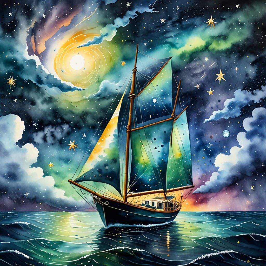 This enchanting watercolor painting depicts a majestic sailboat made of galaxy images, shining with stars and surrounded by swirling clouds, set against a soft, warm blue and green hue backdrop.