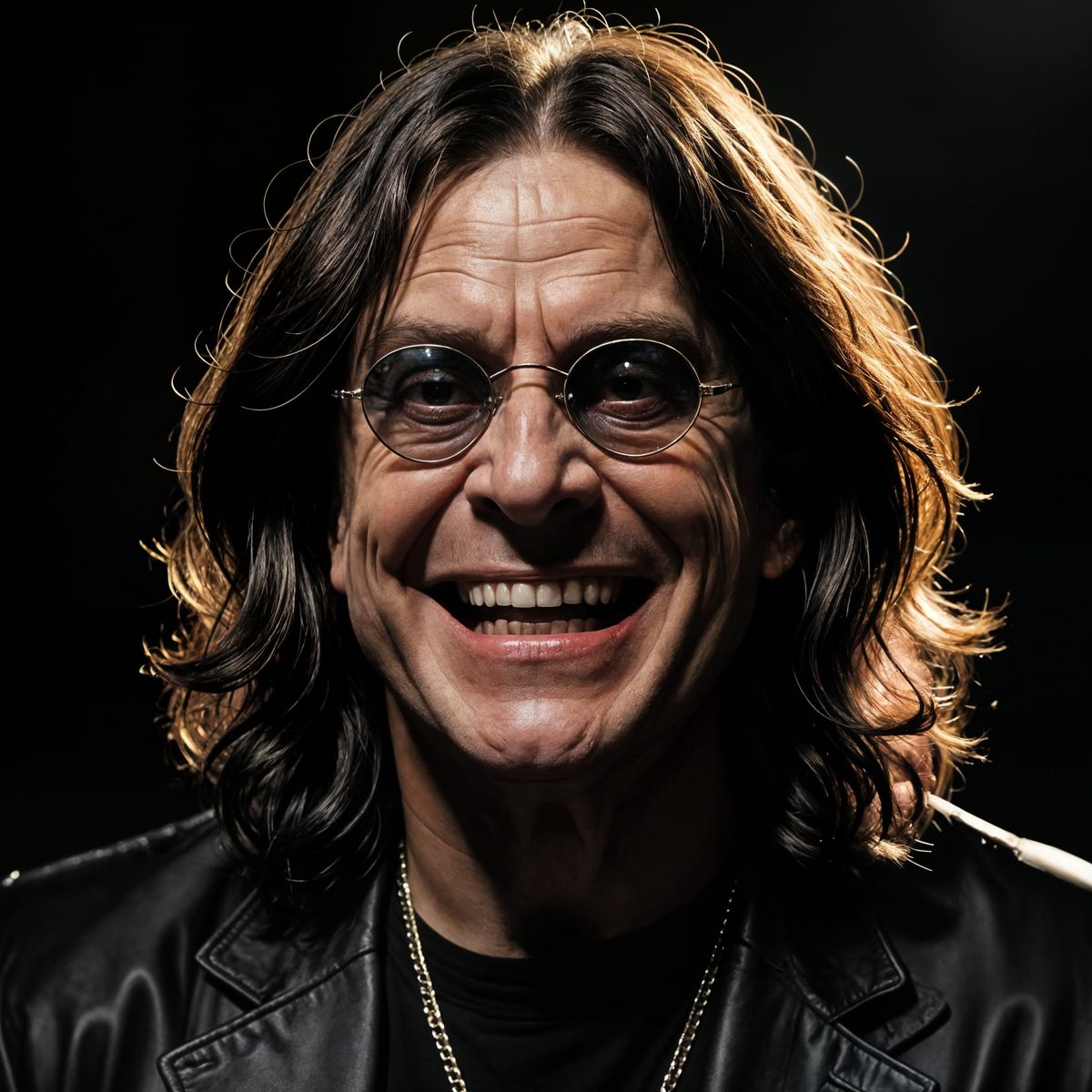 A dramatic portrait of a laughing man with glasses, hunched over with intense emotion. The image, cast in complete darkness with subtle reflections, captures an ominous and realistic scene.