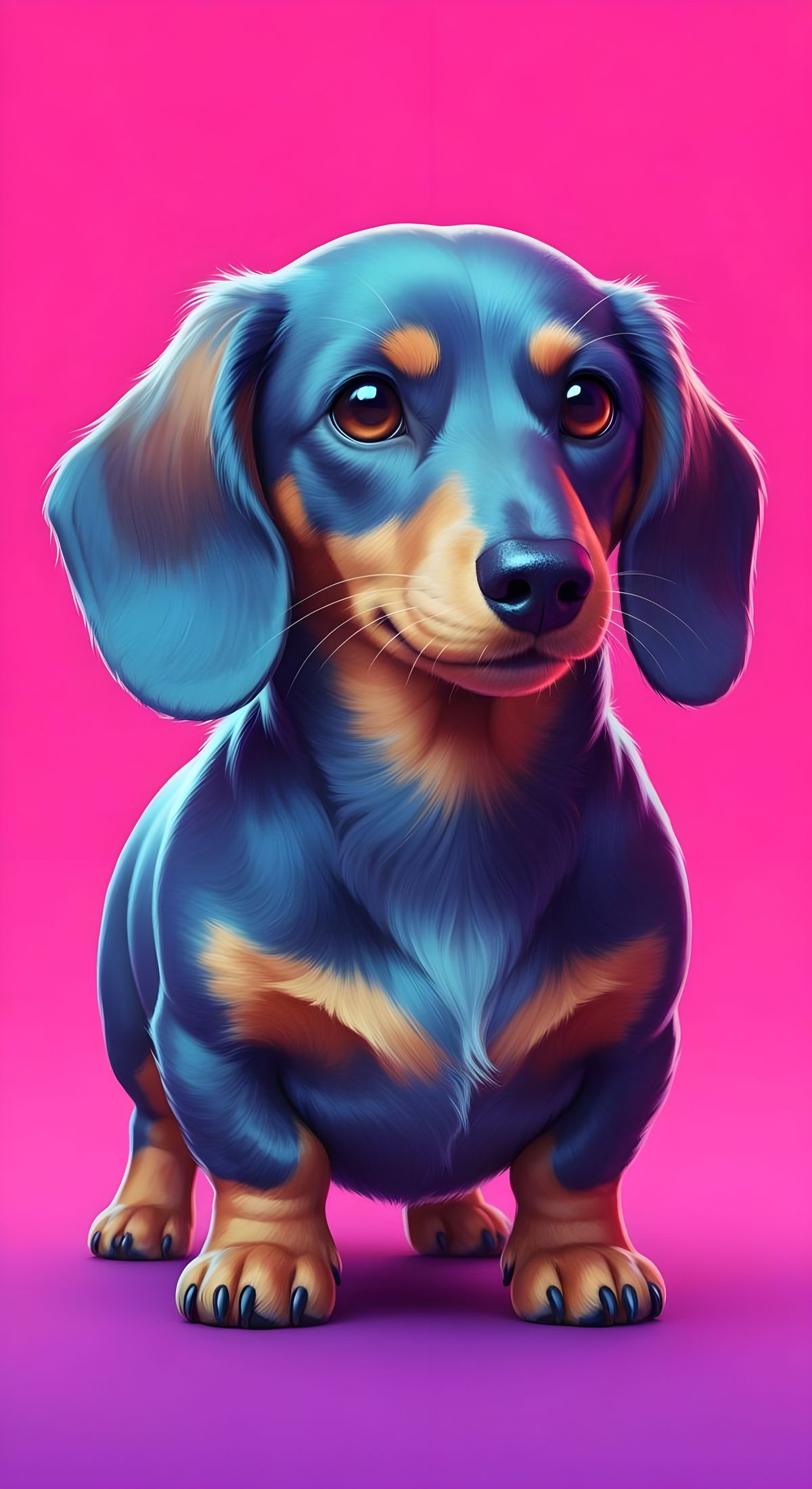 This image showcases an ultra-realistic, cute anime-style Dachshund dog with a simple, solid color background. The focus is on the adorable canine.