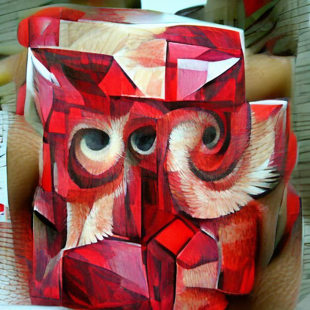 A striking picture of an owl rendered in a cubist style. The artwork features a palette dominated by shades of red, creating a bold and eye-catching aesthetic.