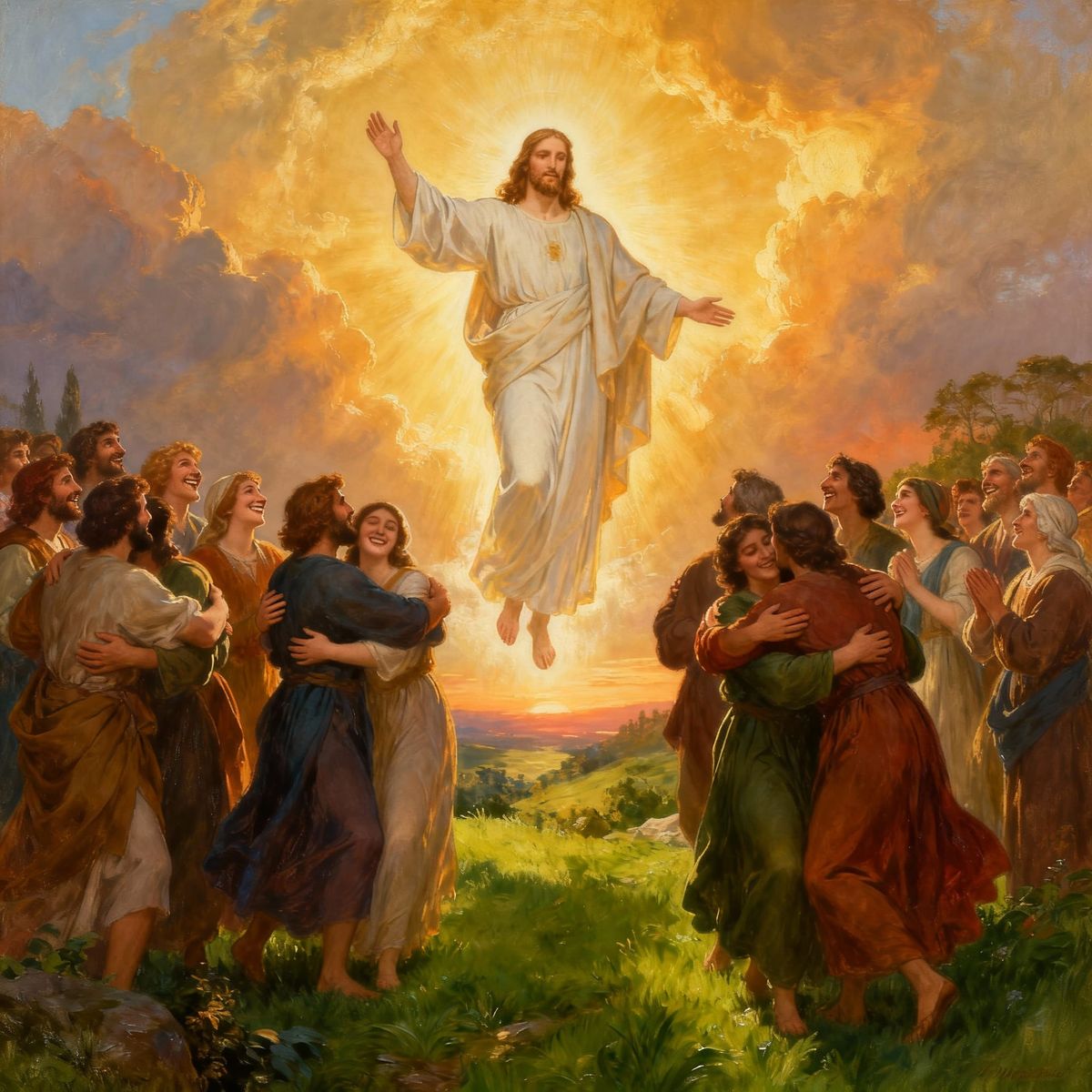 This image depicts Jesus Christ returning to a jubilant Earth, greeted by a loving crowd. Rendered in a majestic painting style with dramatic lighting and rich textures, it evokes spiritual radiance and a heartwarming atmosphere.