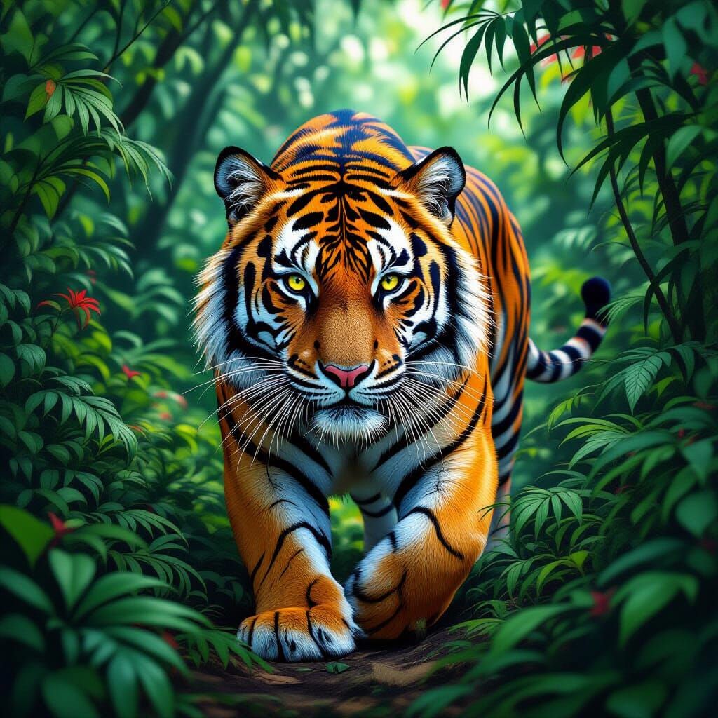 A striking picture of a tiger in Malaysian batik style wandering through a dense rainforest. This hyperrealistic image features splash art elements and dramatic lighting.