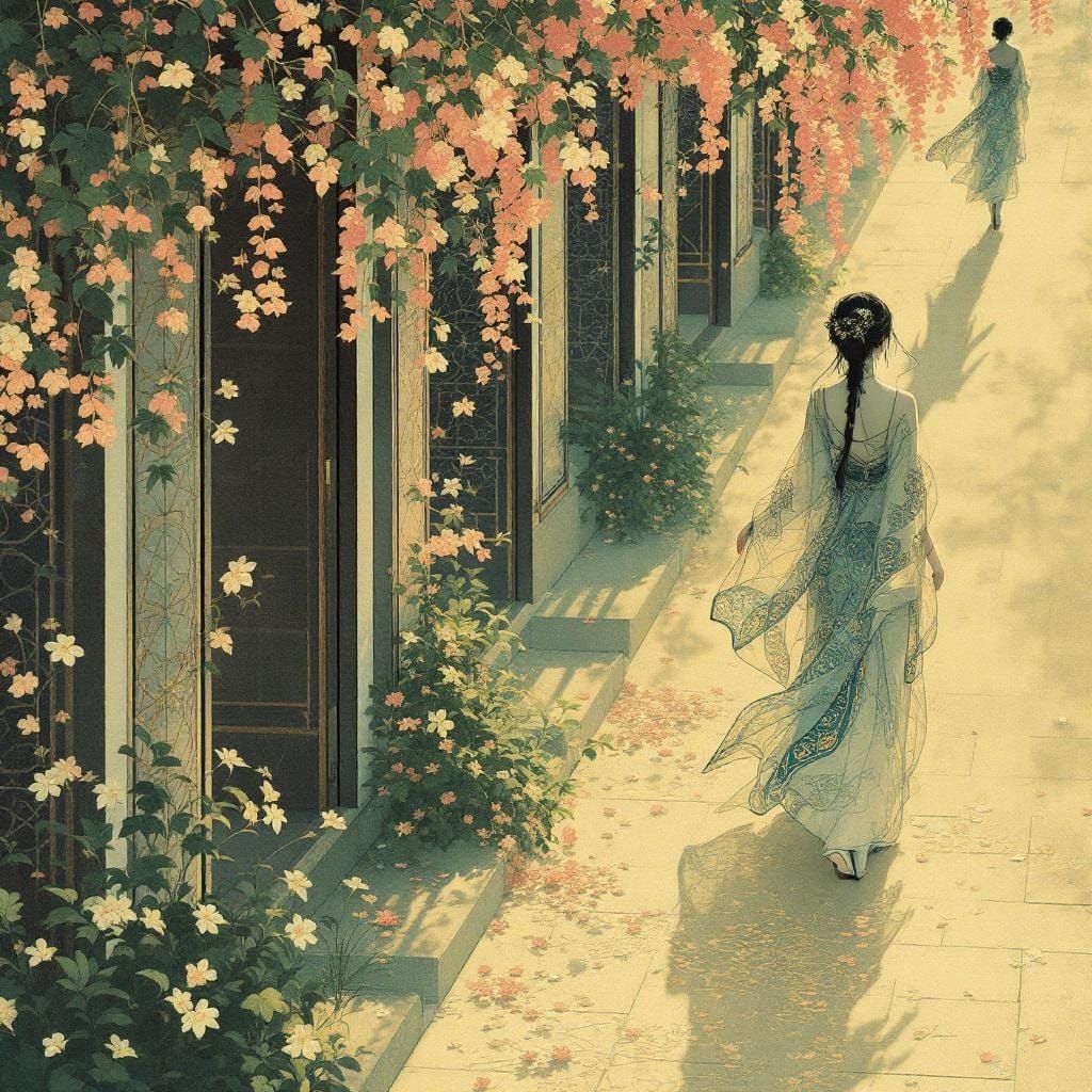 This image shows a figure in layered robes walking down a street. The figure's attire is adorned with geometric patterns and metallic edging, rendered with theatrical color planes and jewel-box depth.