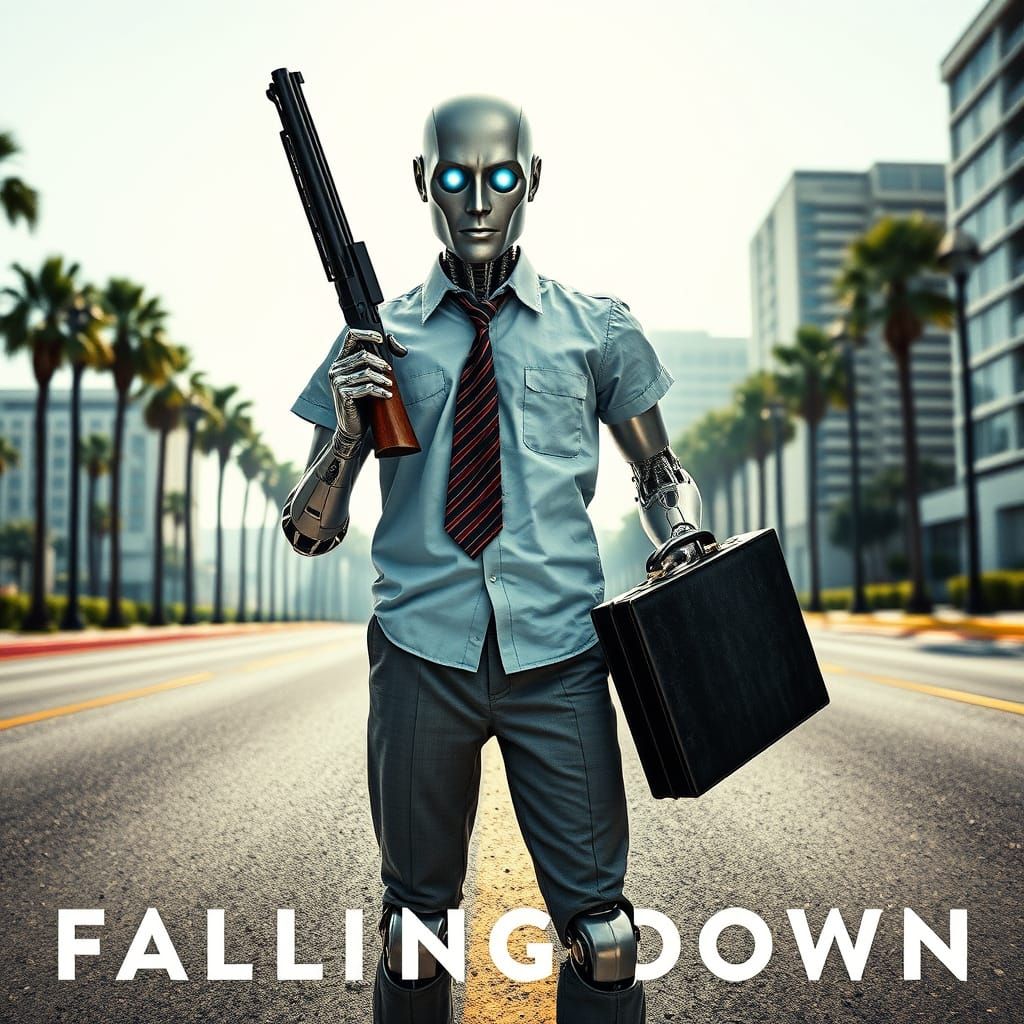 A humanoid robot with a metallic body and glowing blue eyes is dressed in everyday clothing, contrasting its artificial nature with its mundane outfit and exposed mechanical limbs.