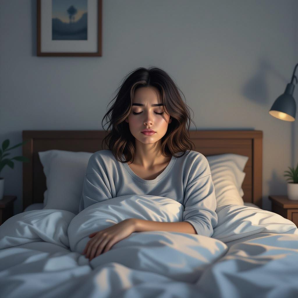 This image shows a person sitting on their bed, appearing tired with dark circles, conveying chronic fatigue. Created as surreal, melancholic digital art with muted tones and soft light.