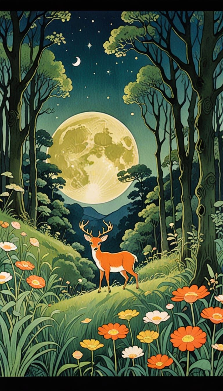 This image shows a serene forest clearing in a naïve landscape style. The scene features a field of flowers, tall grass, deer, and silhouetted trees under a bright orange sky with a harvest moon, rendered in soft, dreamy colors with art nouveau influences.