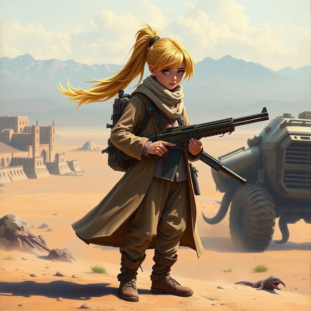 This image shows a young nomadic warrior with striking yellow-pink hair, standing in a post-apocalyptic desert landscape, surrounded by ruins and a monstrous creature, in a style reminiscent of oil on canvas textures and sci-fi desertpunk aesthetics.